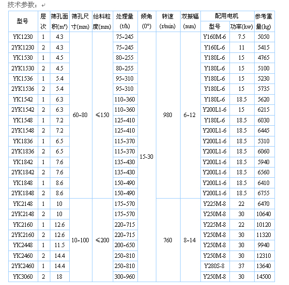 1、YK型塊偏心圓振動(dòng)篩系YA型軸偏心圓振動(dòng)篩的更新?lián)Q代產(chǎn)品,有20個(gè)定型規(guī)格并分別有敞開(kāi)型和封閉型兩種結(jié)構(gòu)形式。本系列振動(dòng)篩有輕型和重型之分,適用不同物料粒度級(jí)別的篩分,選用時(shí)請(qǐng)確定電壓制式及有無(wú)防爆要求;